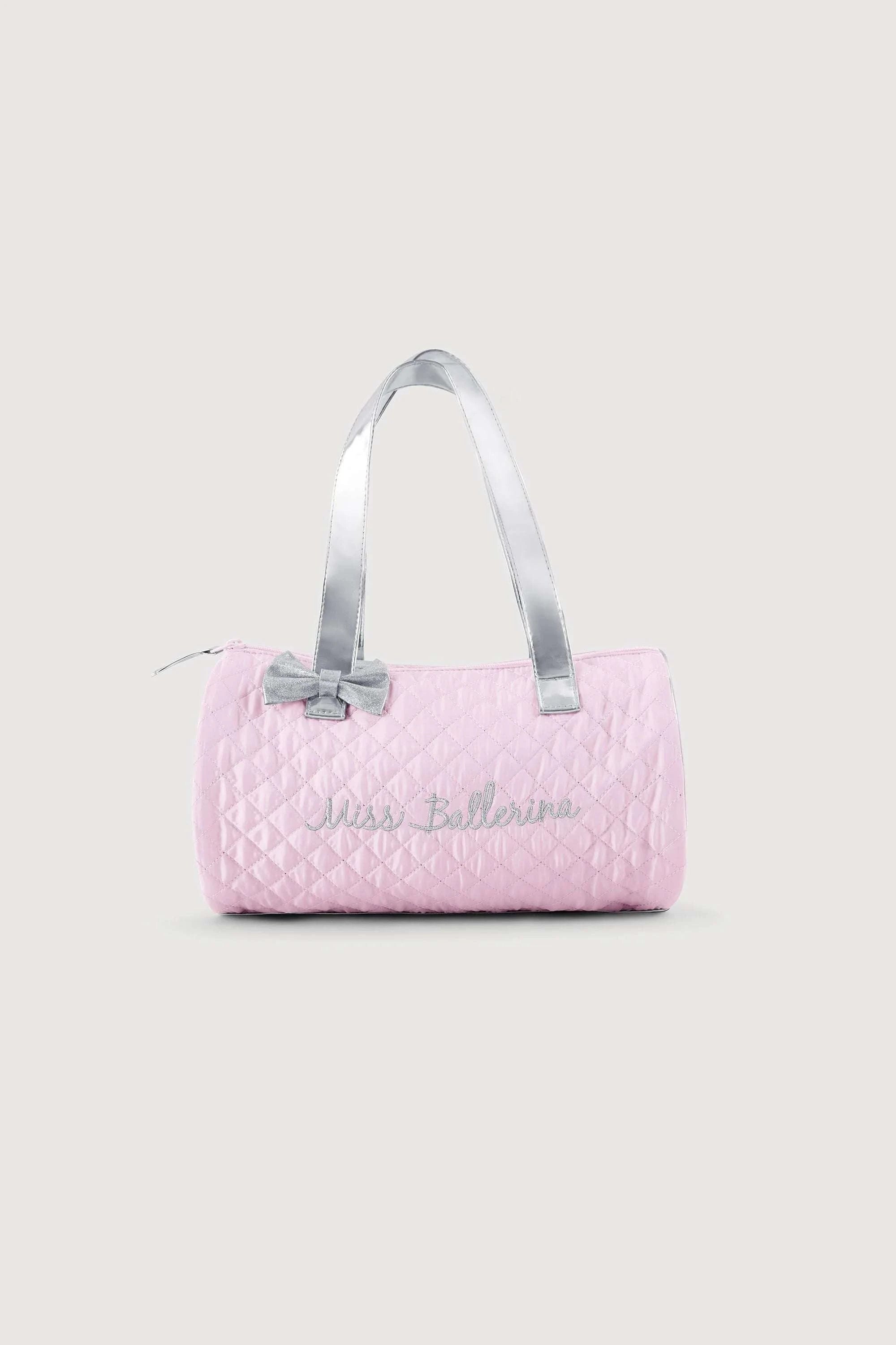 Designed for an aspiring young dancer, the Miss Ballerina bag is lightweight and a perfect introductory bag for a dancer just starting out. A soft, diamond body motif and metallic hand-held straps make for an easy-to-carry bag on the go. With silver piping, glitter bow, and an embroidered 'Miss Ballerina' for an extra special touch.